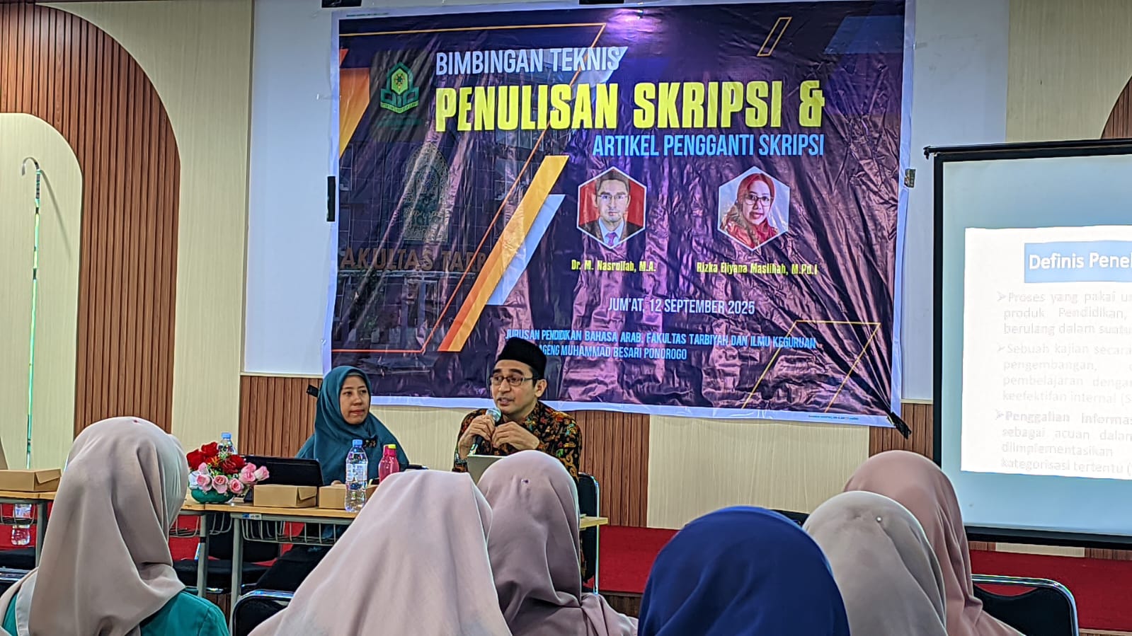 Pendekatan Research and Development (R&D) menjadi salah satu sorotan utama dalam Bimbingan Teknis Penulisan Skripsi dan Artikel Pengganti Skripsi yang diselenggarakan Program Studi Pendidikan Bahasa Arab Fakultas Tarbiyah dan Ilmu Keguruan Universitas Islam Negeri Kiai Ageng Muhammad Besari Ponorogo pada Jumat, 12 September 2025 di Aula Minihall lantai 3 Gedung FTIK.